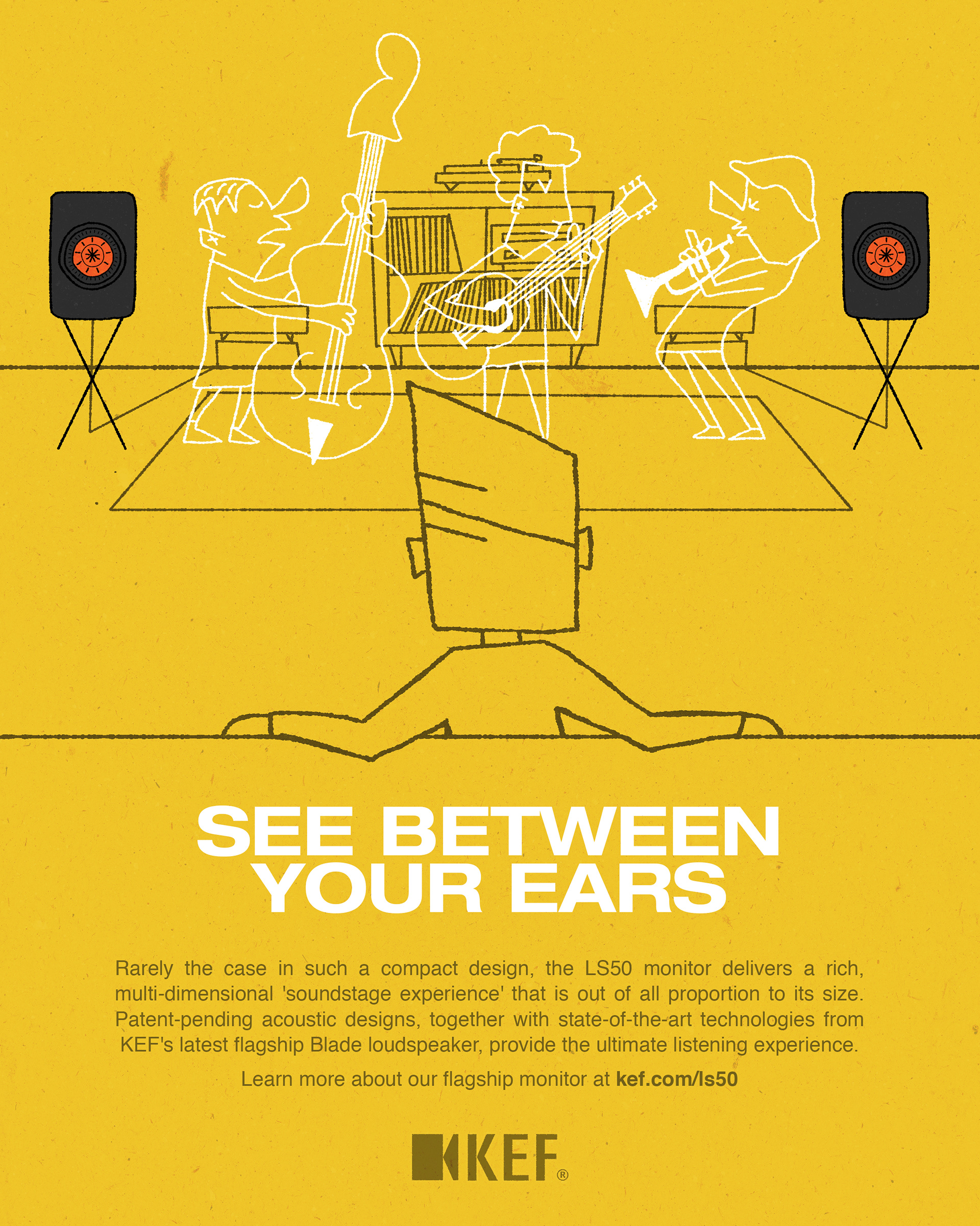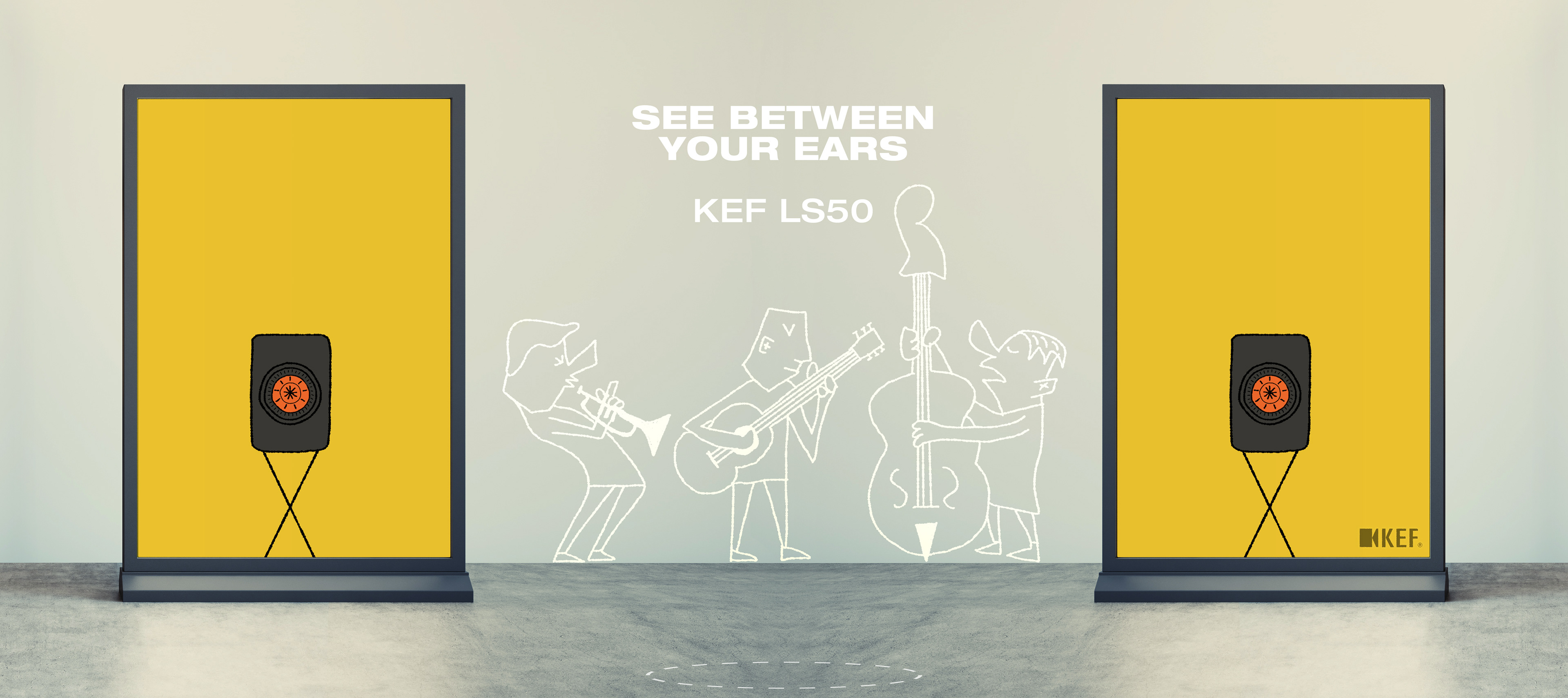 Being a speaker hobbyist I wanted to visually explain what sound imaging is with high fidelity speakers. The tagline of "Seeing Between Your Ears" represents how you can hear the the placement of musicians in a recording. The Kef LS50 was chosen for its superiority in sound imaging as well as its iconic design. The placement of the speakers is imperative to create the illusion of imaging, the photo ad below demonstrates that by taking up two whole posters and placing the white vinyl characters in between them. The character design borrows heavily from mid century design, which was chosen as to hearken back to the golden age of hifi.
